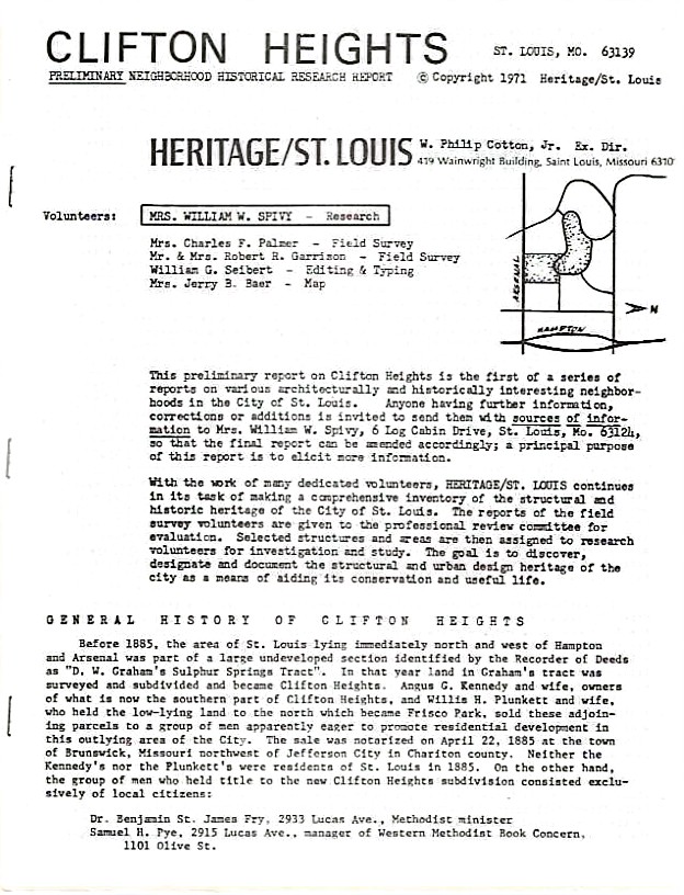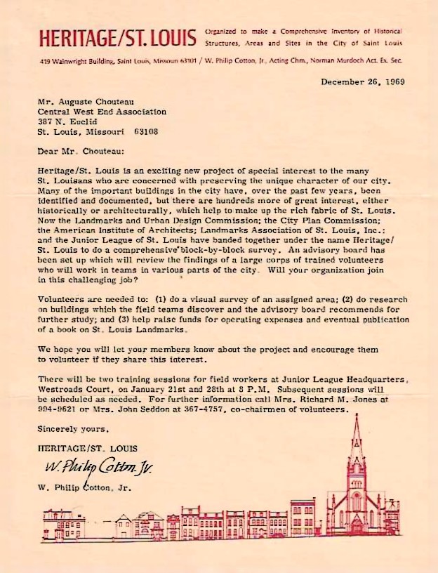 To quote the Chairman of Heritage STL, architect W. Phillip Cotton, Jr., “the survey could provide information useful to the Landmarks Commission in choosing official landmarks. But its actual purpose is simply to help St. Louisans to recognize whatever in the city is of historical or architectural importance, wherever it is. This is more than an effort to keep ahead of the headache ball and the bulldozer. We want to locate the buildings and neighborhoods of earlier times that deserve special consideration and, in this way, to become better acquainted with our city’s heritage.”