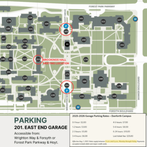 Parking: East End Parking Garage, accessible from Wrighton Way & Forsyth or Forest Park Parkway & Hoyt. Free on weekends.